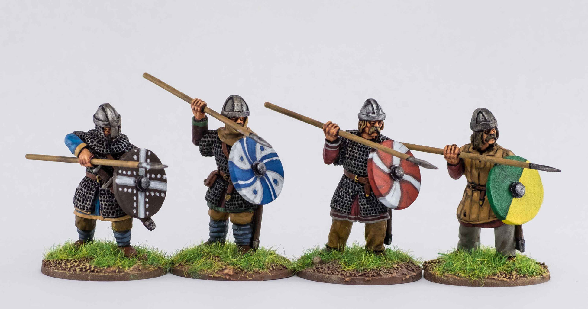 Saxon Armored Thegns. Pack contains 4 miniatures, supplied unpainted and may need some assembly. Weapons and bases supplied.