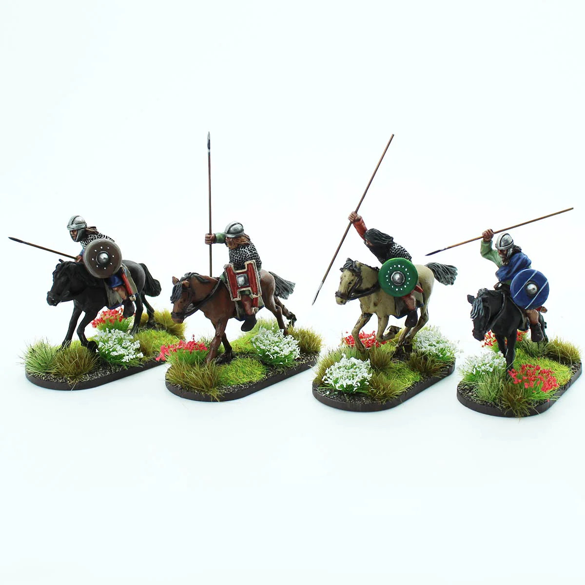 Pack contains 4 different Pict/Scots Noble cavalry riders and 4 ponies.