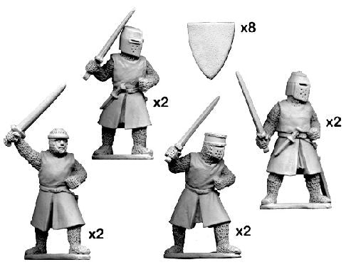 Eight figures per pack, two of each figure shown. Figures are 28mm sized, made of metal and supplied unpainted.