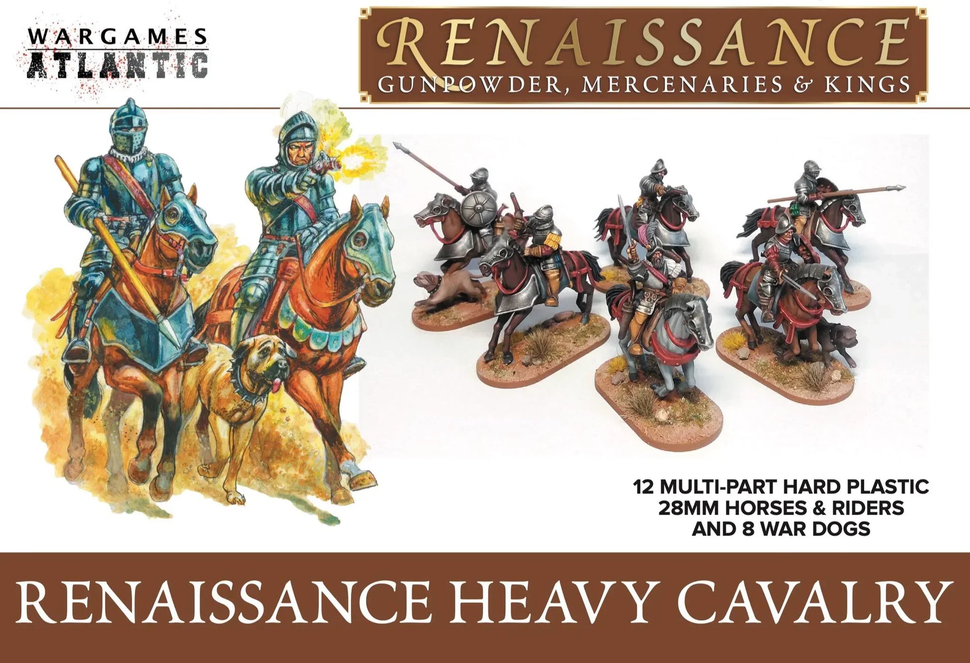 This hard plastic box set allows you to build up to 12 riders equipped with sword, matchlock pistol, wheel-lock pistol, and lance. Optional armor pieces are included for the horses (or the horses can be used plain with the included saddles). A mix of hat and helmet types will expand their use to the battlefields of Europe in the 15th and 16th and into the 17th centuries. 8 War Dogs complete the box.