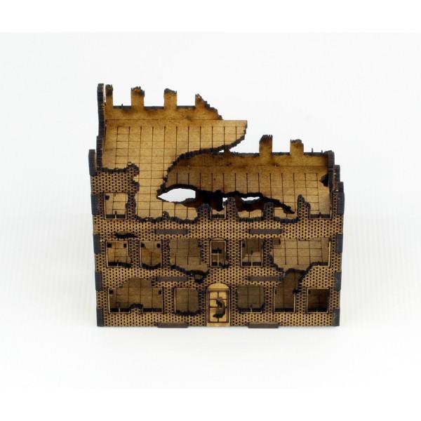 Destroyed, 3-story townhouse lone, from the first half of Twentieth century, dedicated to wargaming in 28mm (1:56) scale and battles of World War II.