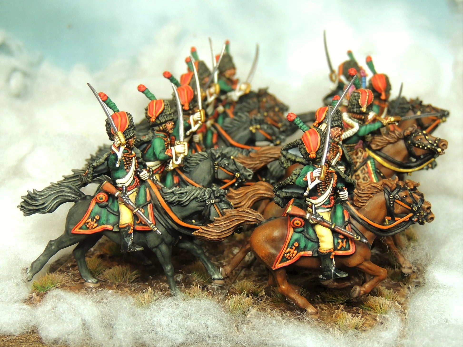 The set includes 12 dynamic charging French Chasseurs a cheval of the Imperial Guard, one of Napoleons Elite light cavalry Regiments.