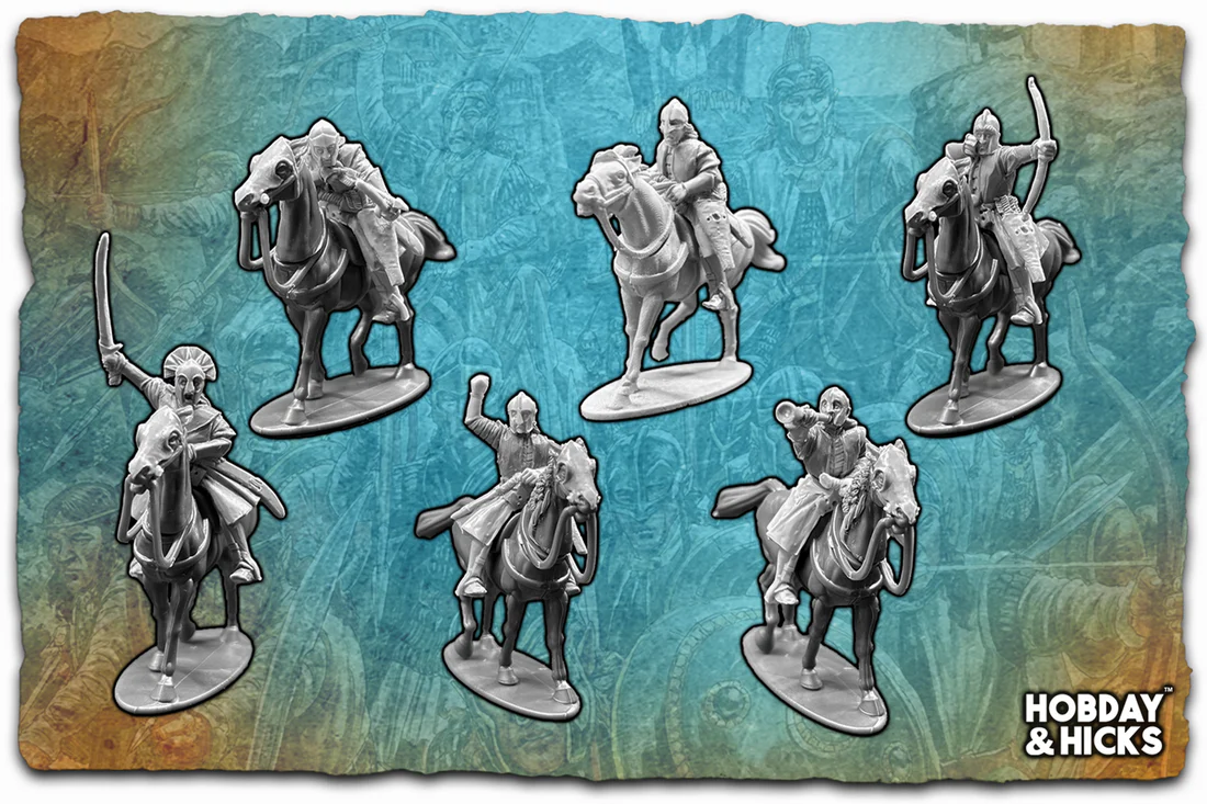 The set contains six, 28mm metal miniatures, plastic horses with resin heads, & 40mm round bases. Miniatures supplied unpainted and may need some assembly. All weapons & spears are included. Please note, you will receive a random assortment of horse heads.
